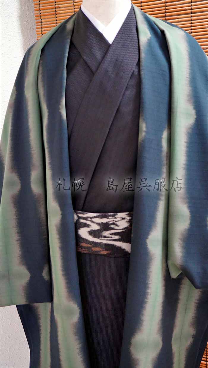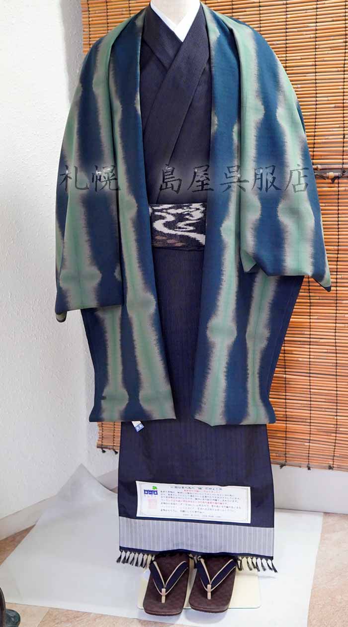 男性はシンプルな黒の正絹の紬に、フォークロア調のような