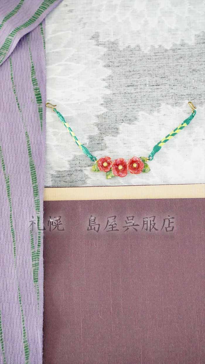 鮮やかで艶のある赤い椿が並ぶ、羽織紐です。