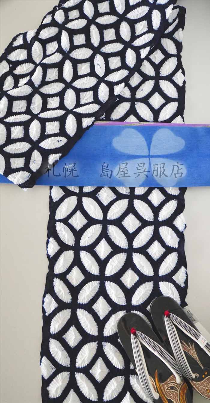 半幅帯:リバーシブル 藤井絞/四つ葉ブルー・竜巻絞りグリーン [53/914]