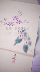 白地に淡い藤紫や青磁色などの優しい色合いは