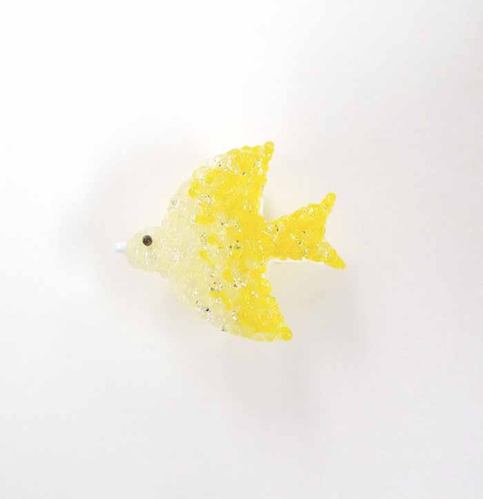 明るいレモンイエローの羽やしっぽ、顔周りの透明部分も